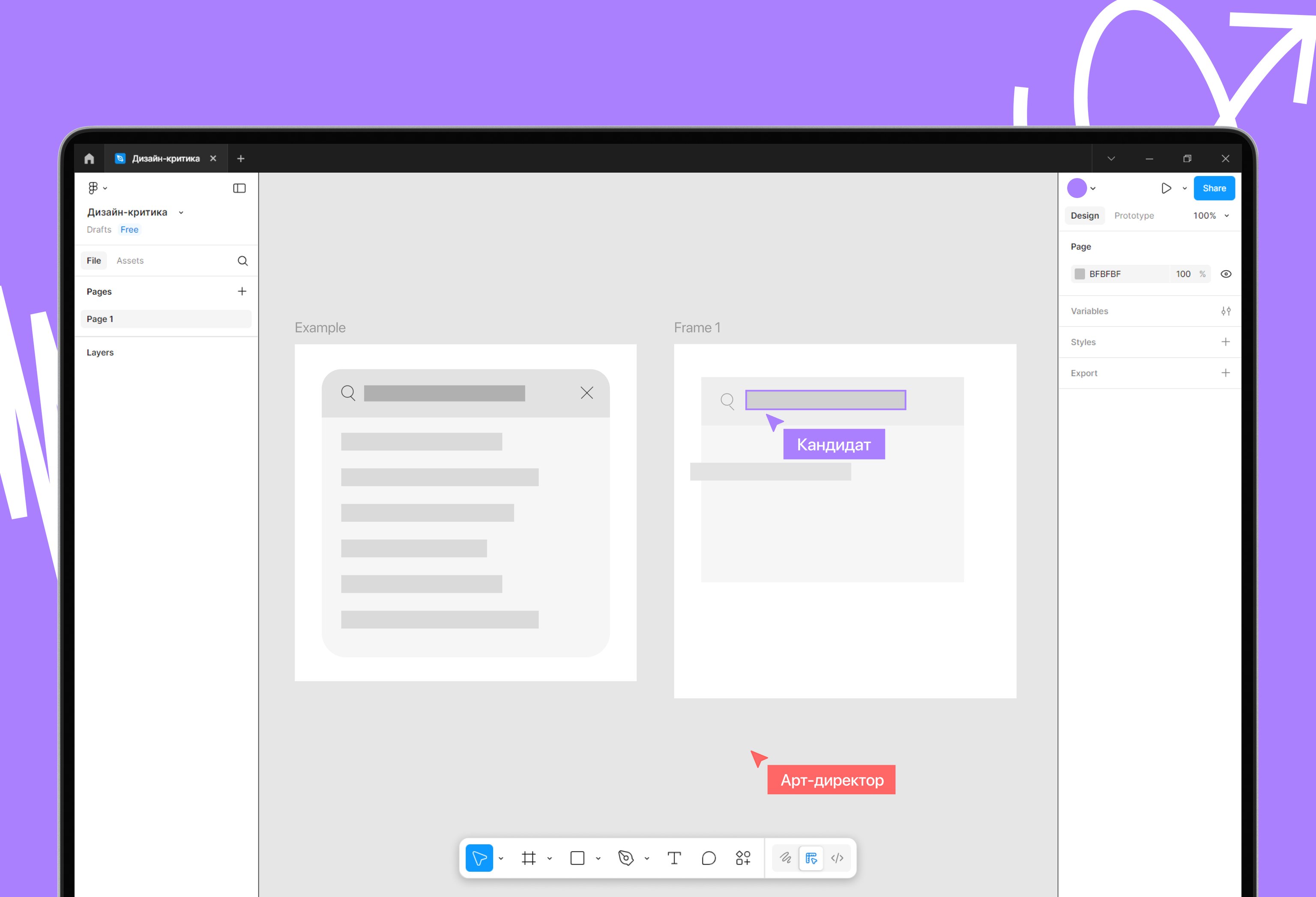- Как работает с инструментом.Просим работать с расшаренным экраном. Смотрим, как кандидат пользуется Figma. Не углубляемся в автолэйауты и компоненты — больше интересует, насколько быстро и уверенно он вообще с ней работает. Это влияет на скорость выполнения задач и общее понимание инструмента.