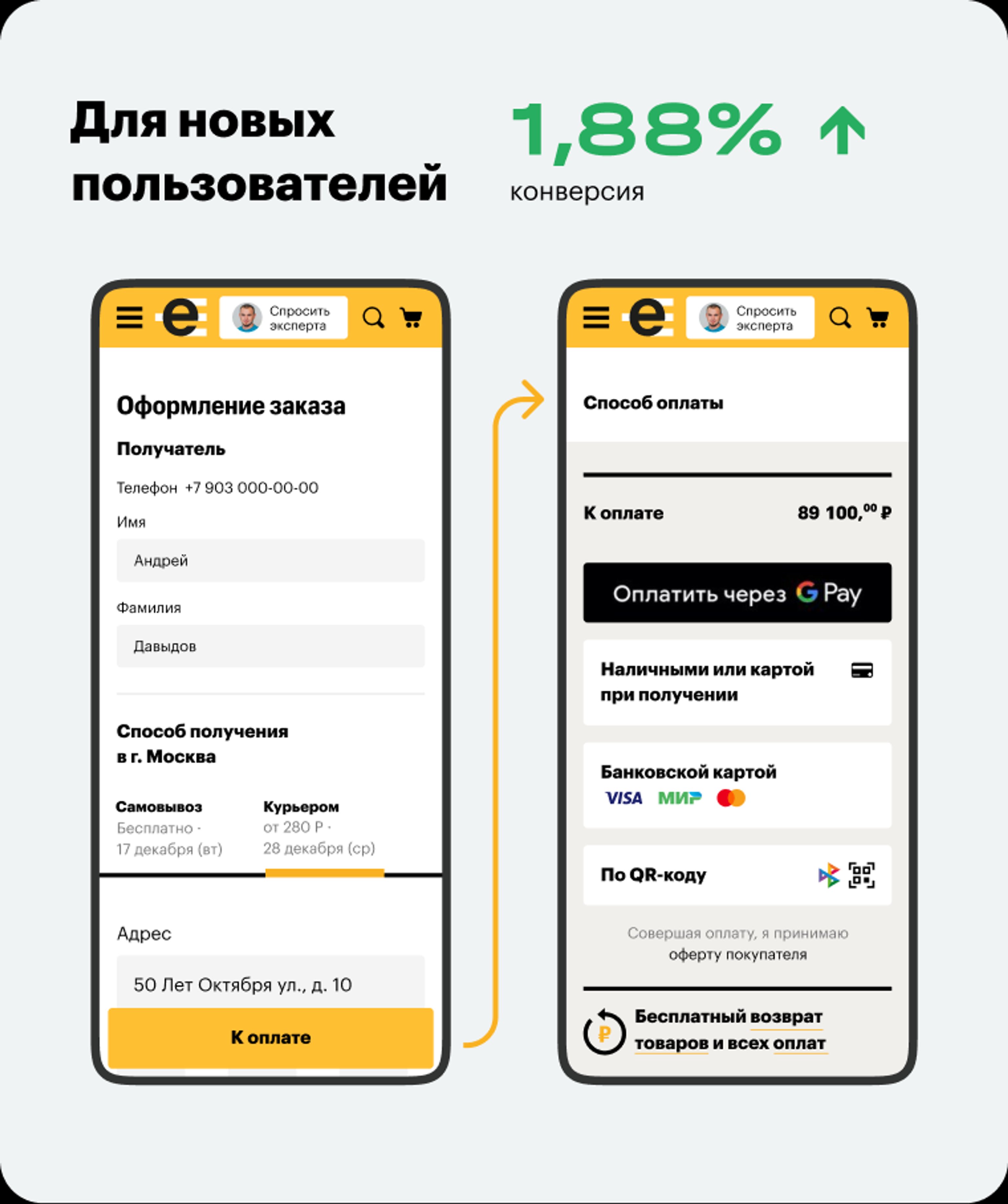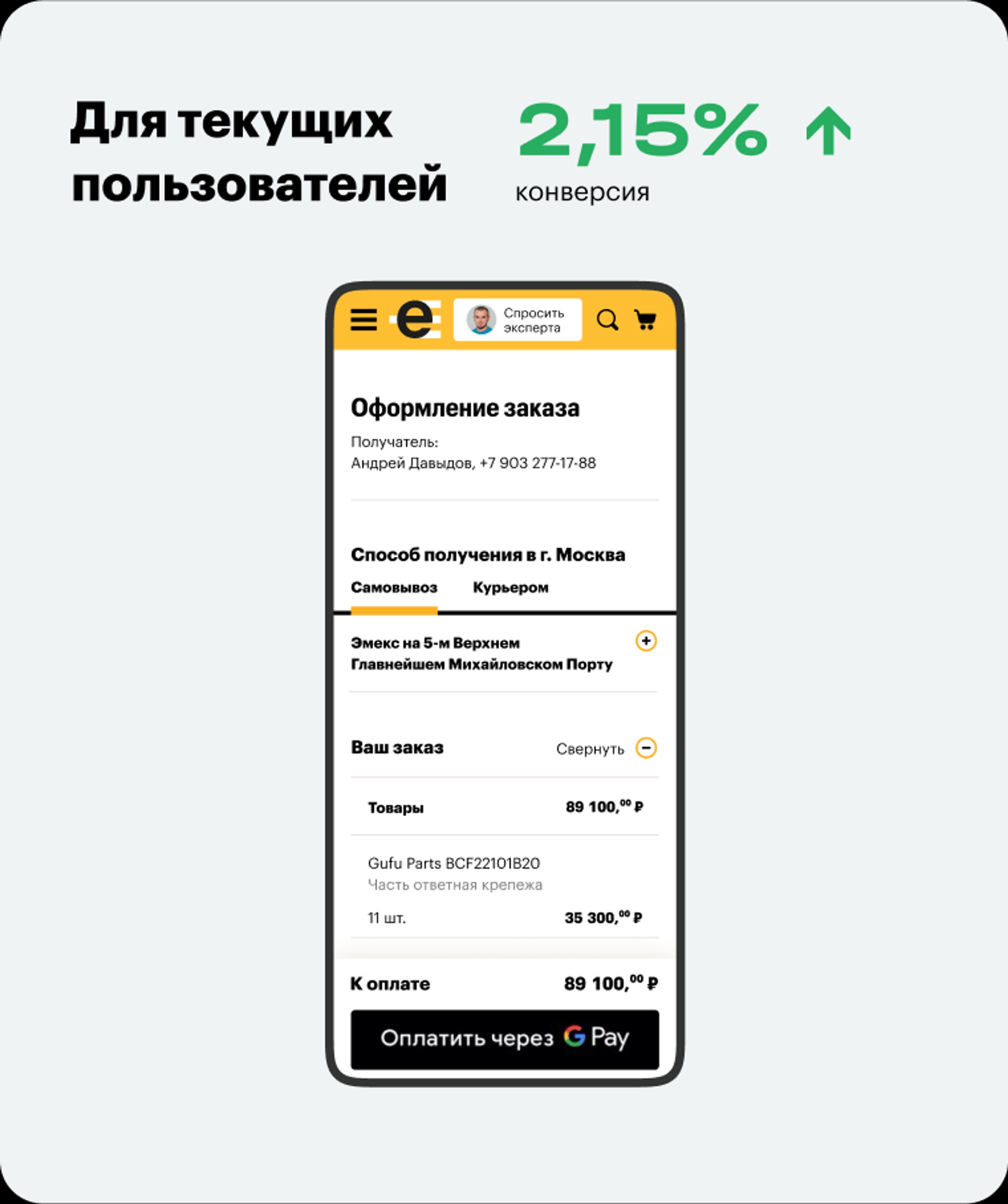 Пример: у Brele был кейс, где мы делали редизайн маркетплейса автозапчастей Emex. Мы провели A/B-тестирование для вариантов оплаты: залипающая кнопка скроллинга к списку вариантов или автоматический предвыбор последнего варианта. Вариант с кнопкой доскролла повысил конверсию среди новых пользователей, а с предвыбором последнего использованного варианта оплаты лучше сработал среди текущих клиентов.