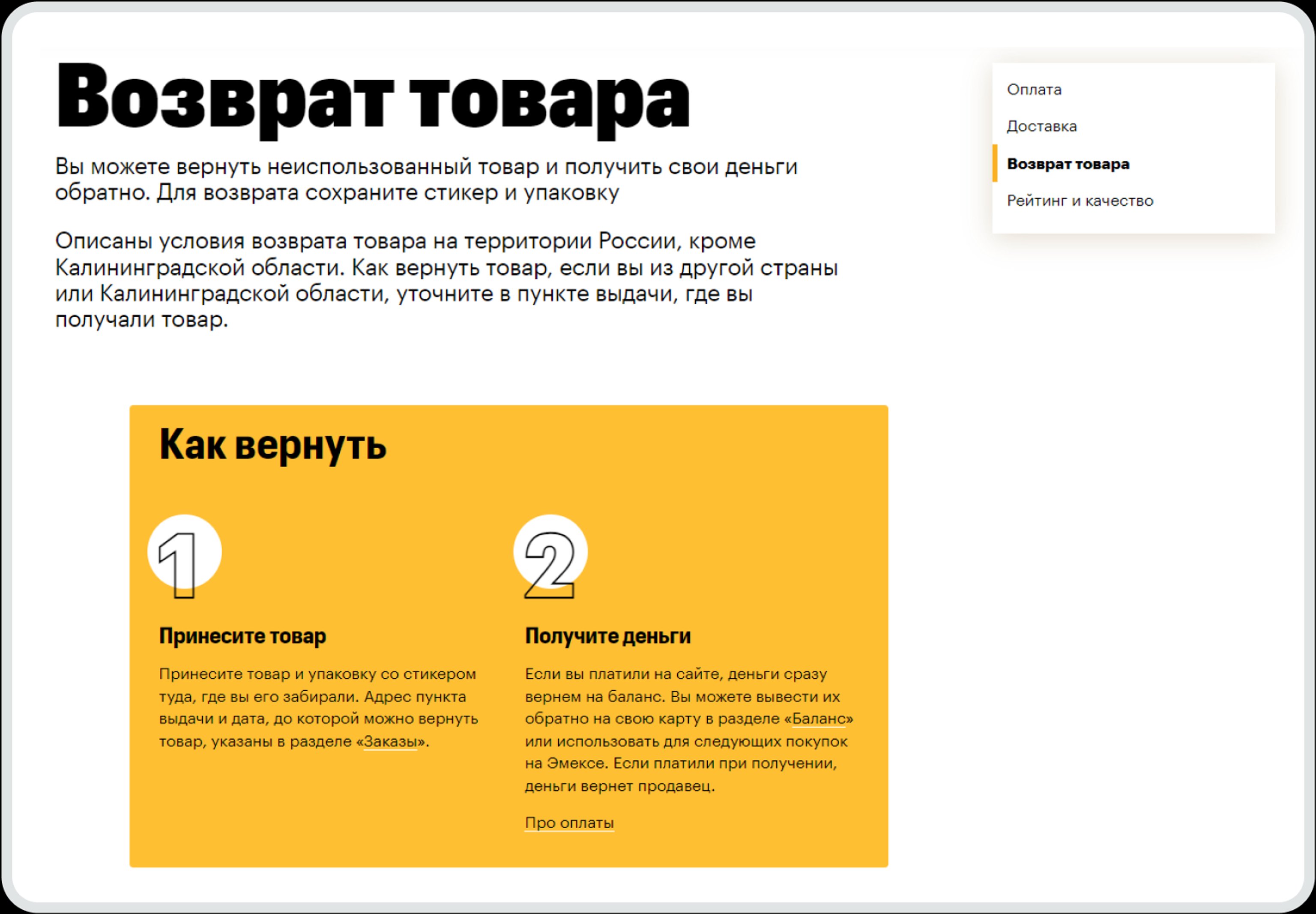 Пример: посмотрите на две страницы сервисов Exist.ru и Emex. Обе страницы дают одинаковые сведения — рассказывают о возврате товара. Но первая страничка сухая и неинтересная, взгляд не выделяет важные моменты, а полотно канцелярского текста сложно воспринимать. А во второй расставлены акценты, отформатирован текст и есть яркие вставки. Её легче читать.