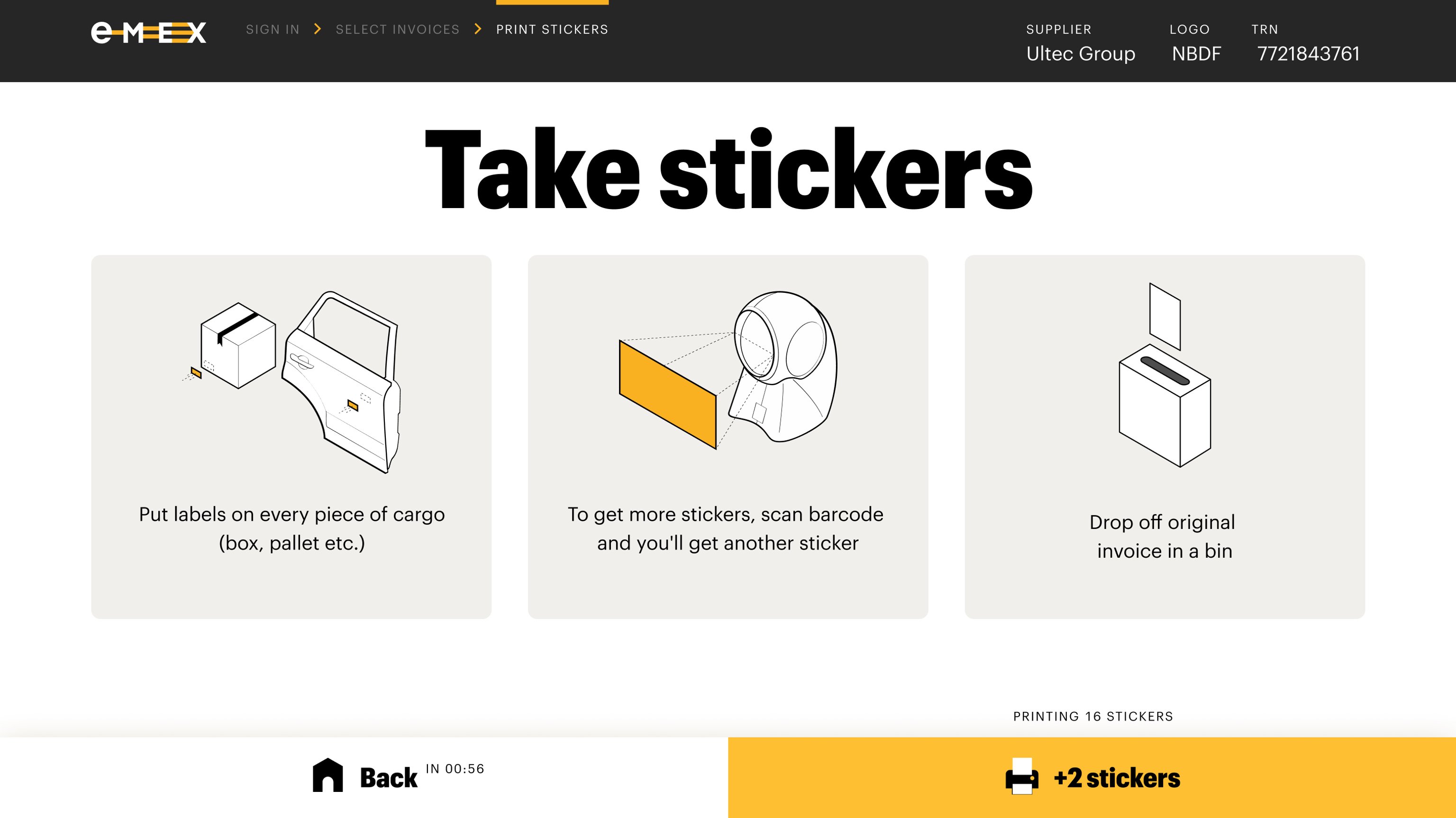 На последний экран мы добавили напоминание для водителей о том, что на все товары важно наклеить наклейки, а после — положить бумажные документы в специальный ящик. Если наклеек не хватает, водители могут отсканировать штрих-код и напечатать ещё.
