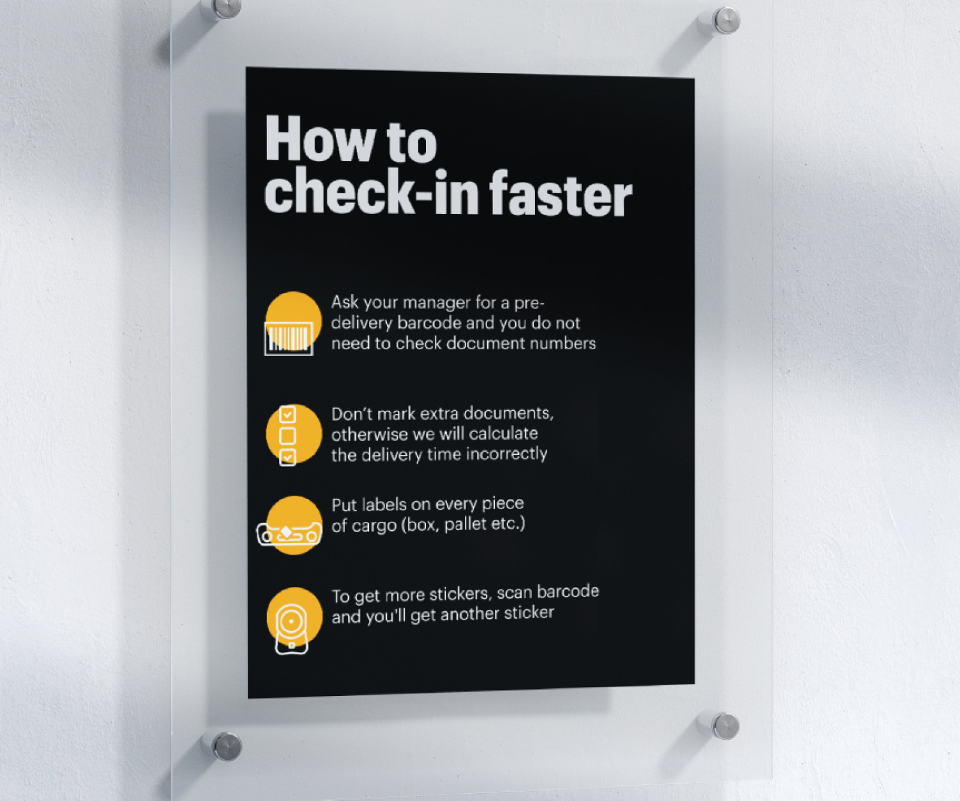 Мы изучили поведение водителей, которые первый раз попадают на склад, и создали симпатичные плакаты с инструкцией по сдаче груза и указателями. Один плакат разместили в курилке — туда водители чаще всего идут за помощью, если не знают что делать. Ещё три висят там, где водитель выходит из машины.